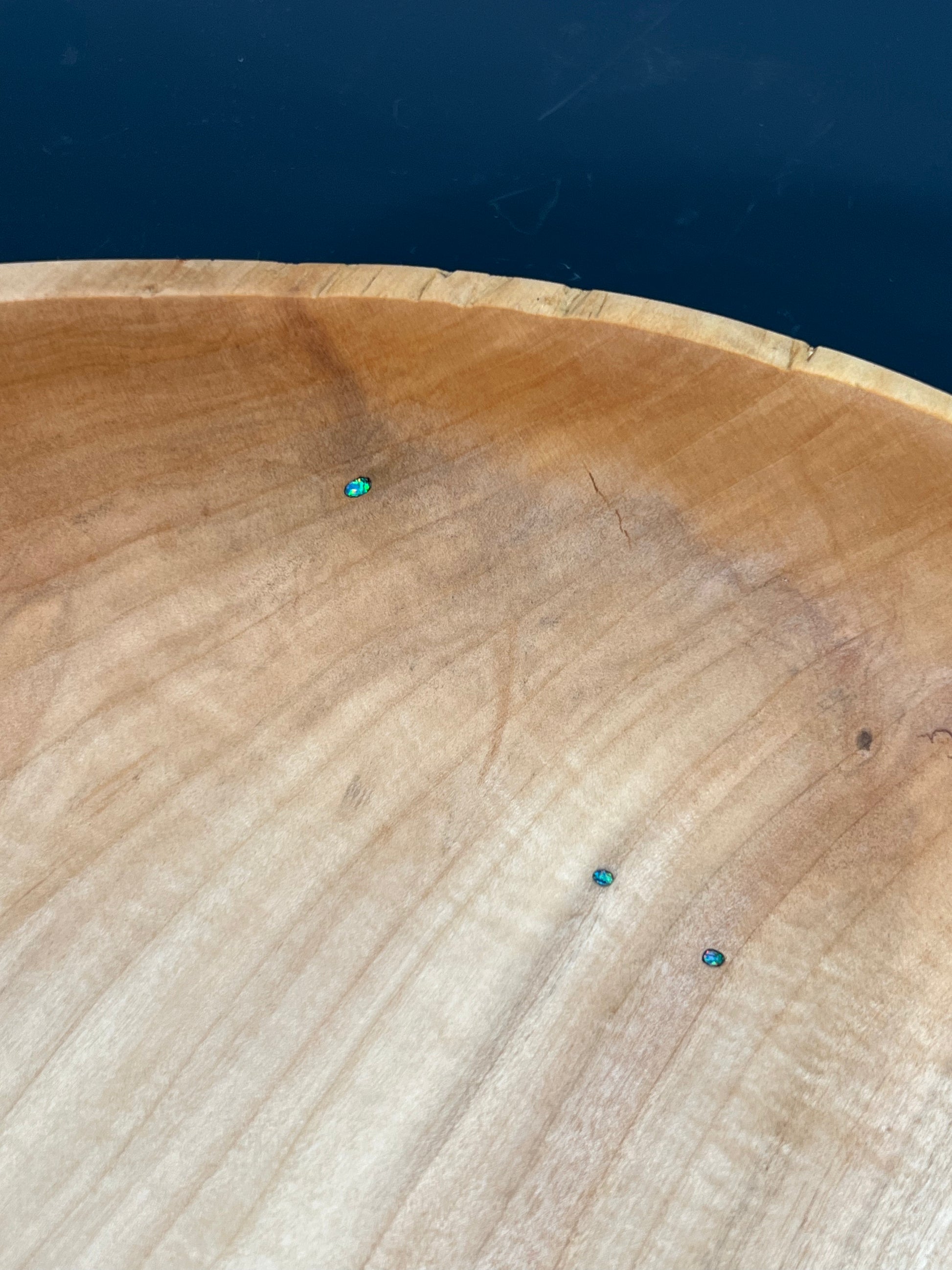 This 17” spalted maple salad bowl took a hard fall onto a brick pathway at a show in Pensacola. That provided an opportunity to do a kintsugi style repair on it. In Japanese tradition, broken pottery is mended with gold (the word literally means “golden repair”) In this case, I used turquoise along with opal in smaller “defects”