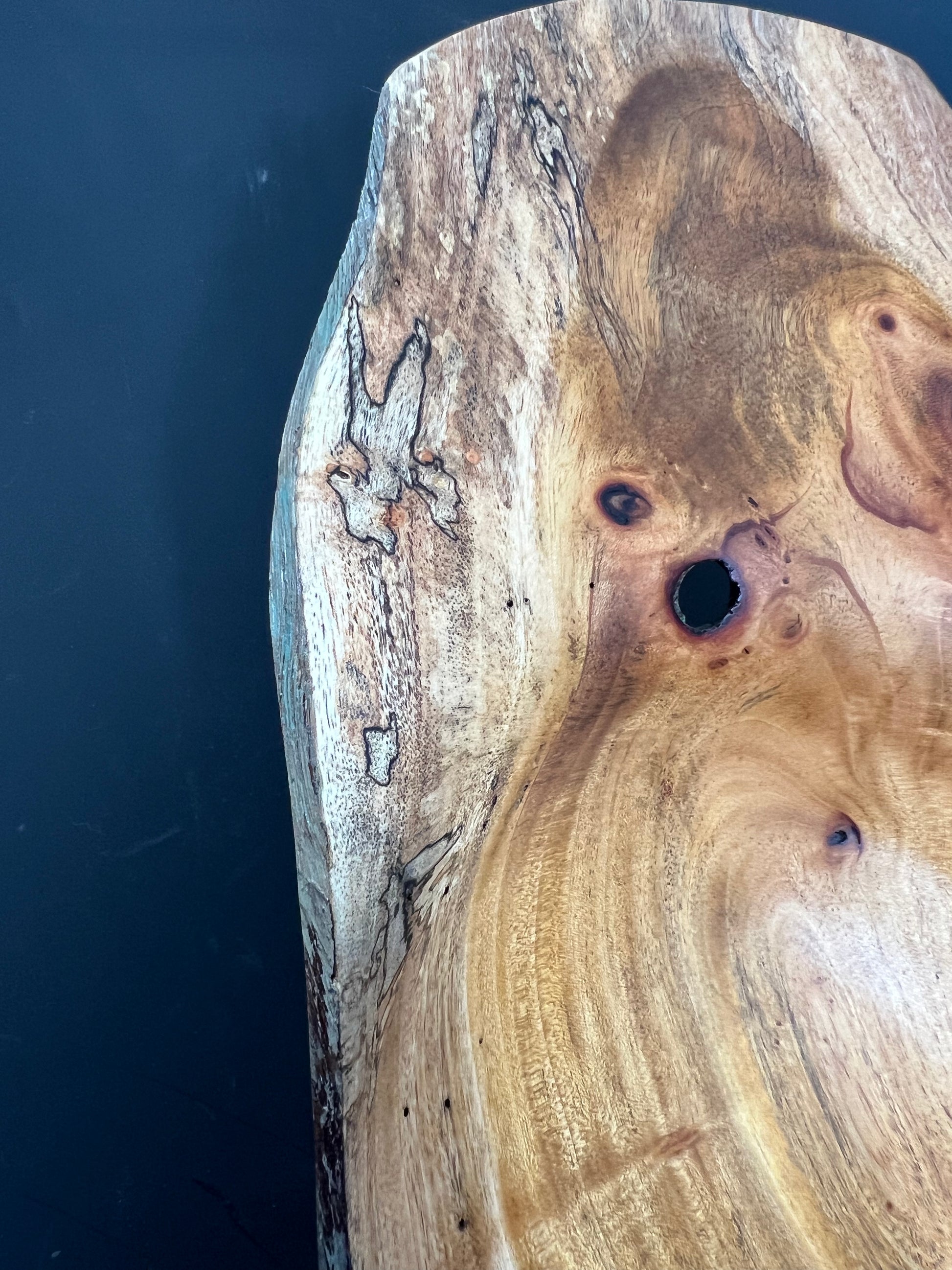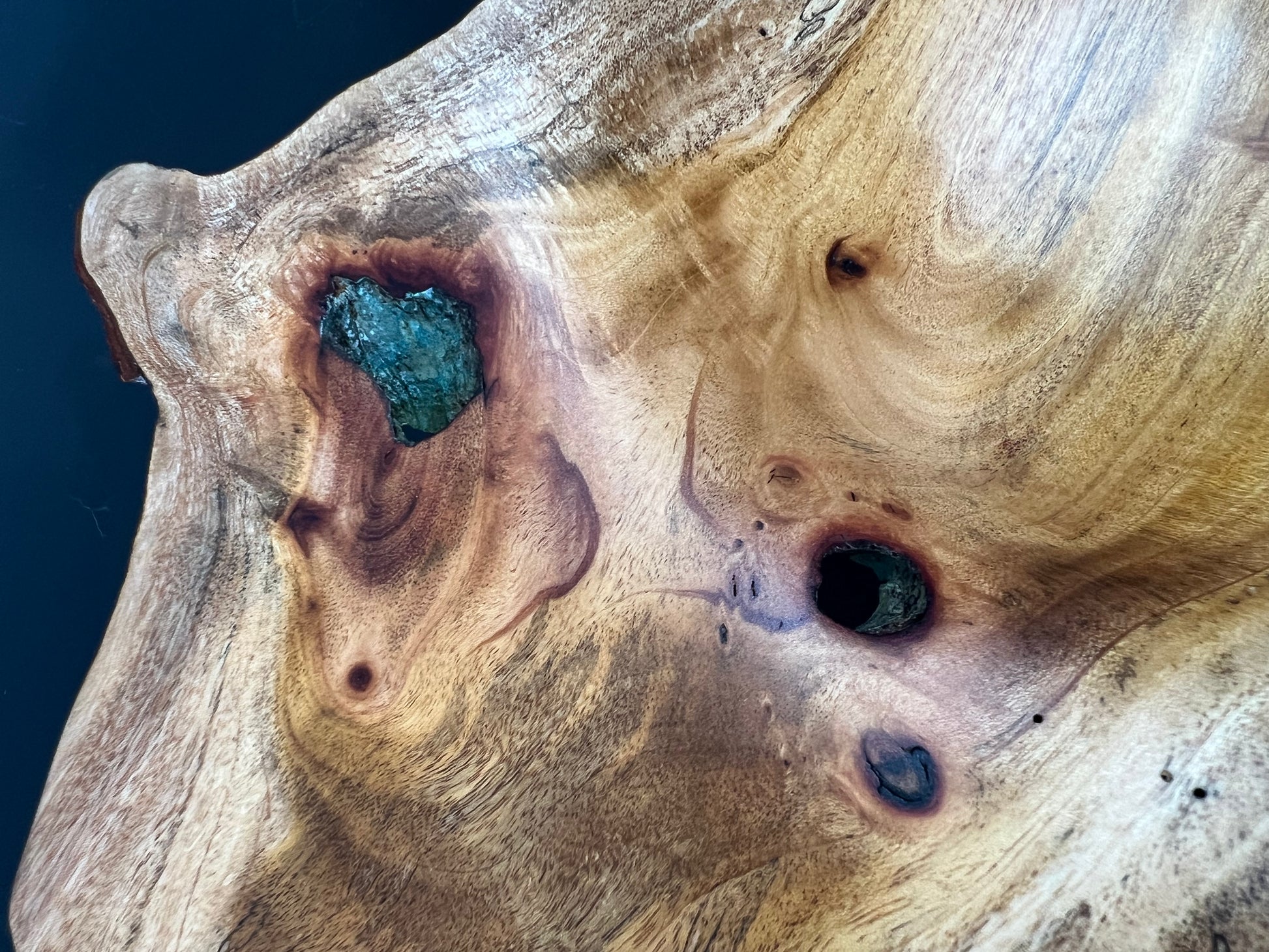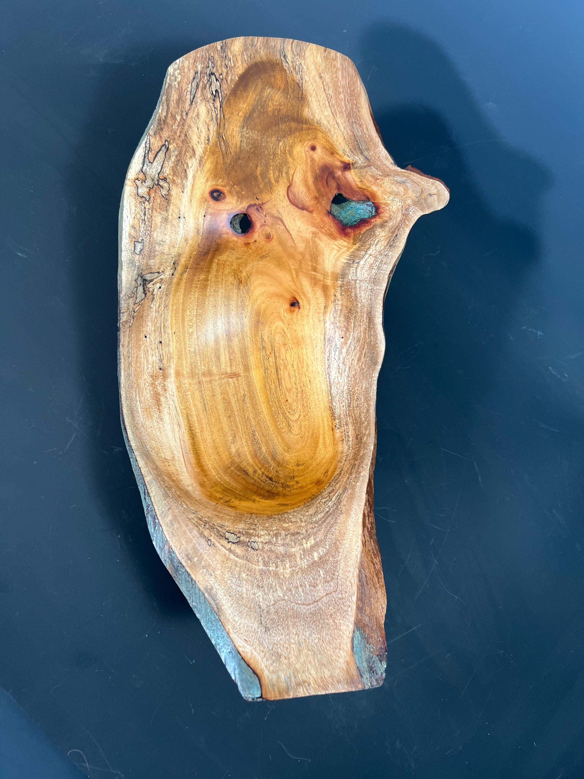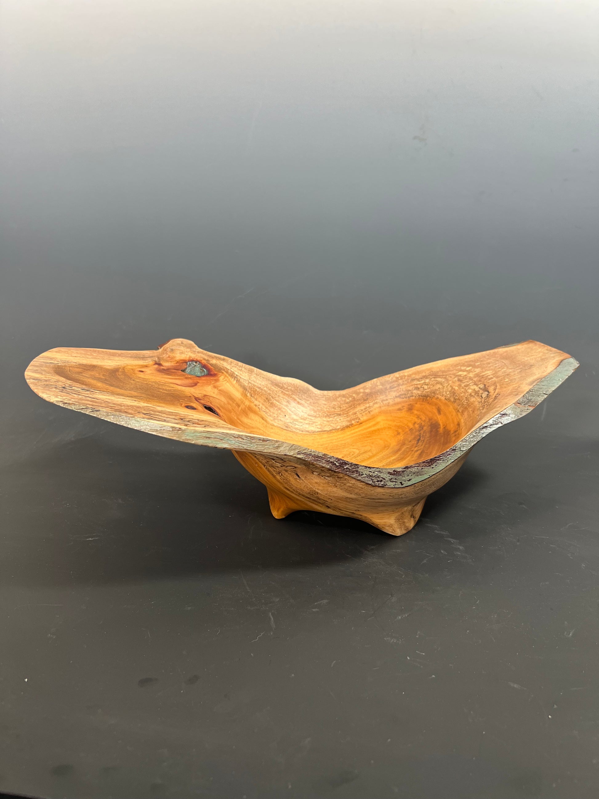 This winged bowl form was turned from a single branch of Cuban mahogany and embellished with copper and carved feet. The subtle blues and greens of the copper patina complement the mahogany’s deep, earthy tones. This is one of my favorite forms, and one of my favorite pieces. The dimensions are 16” long, 5” high, 8” wide with a 7” bowl. It has a semi-gloss polyurethane finish.