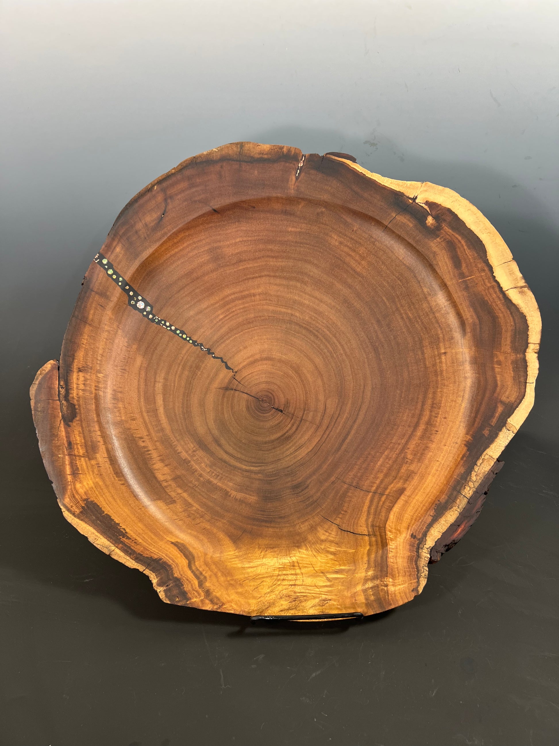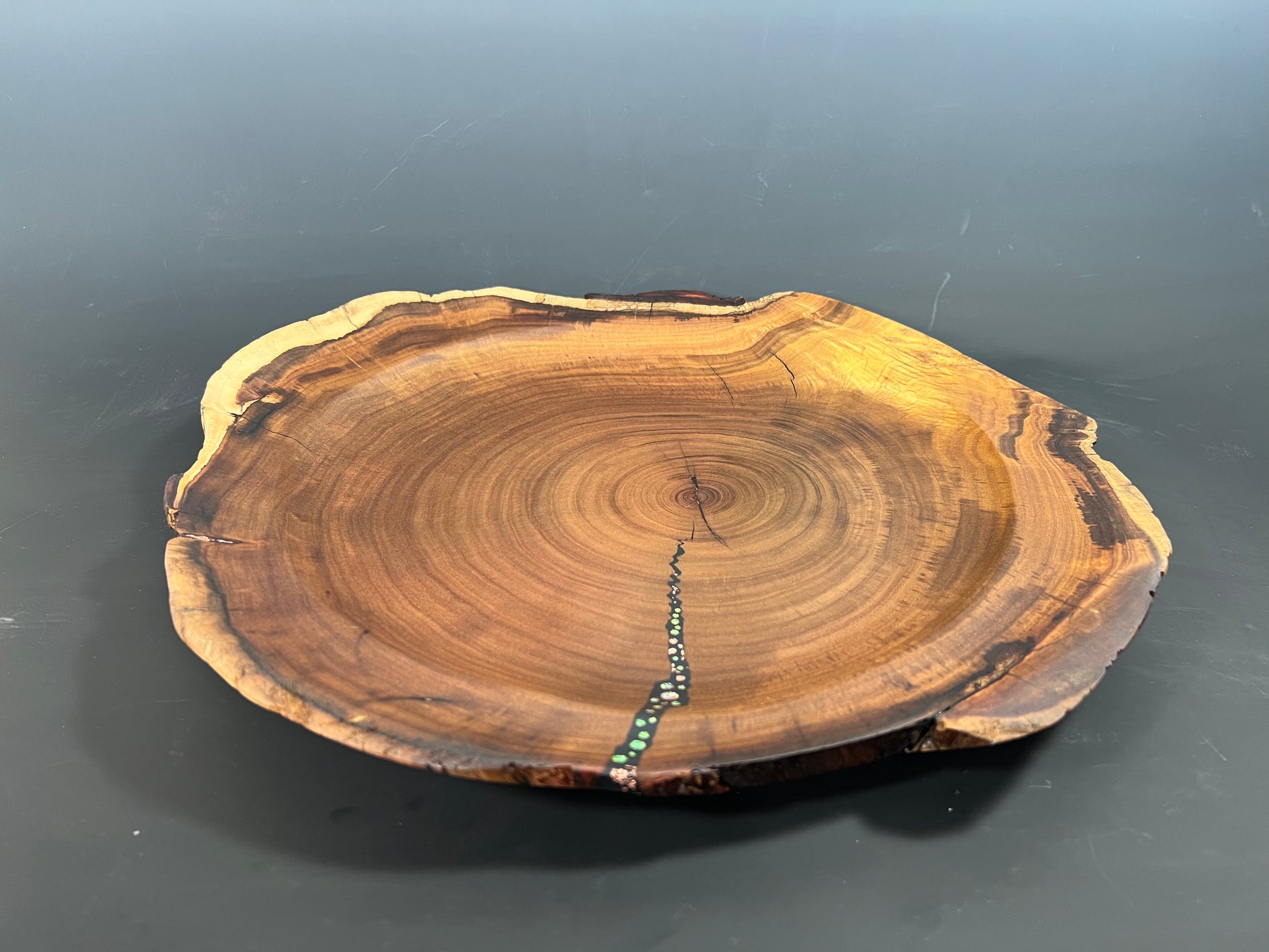 This tamarind platter works as well for serving or displaying as art. The lovely earth tones of tamarind wood contrast beautifully with several inlays of opal and copper. This piece is ~17” wide with an organic live edge and 2” tall on tiny carved feet. It has a durable, food-safe finish.