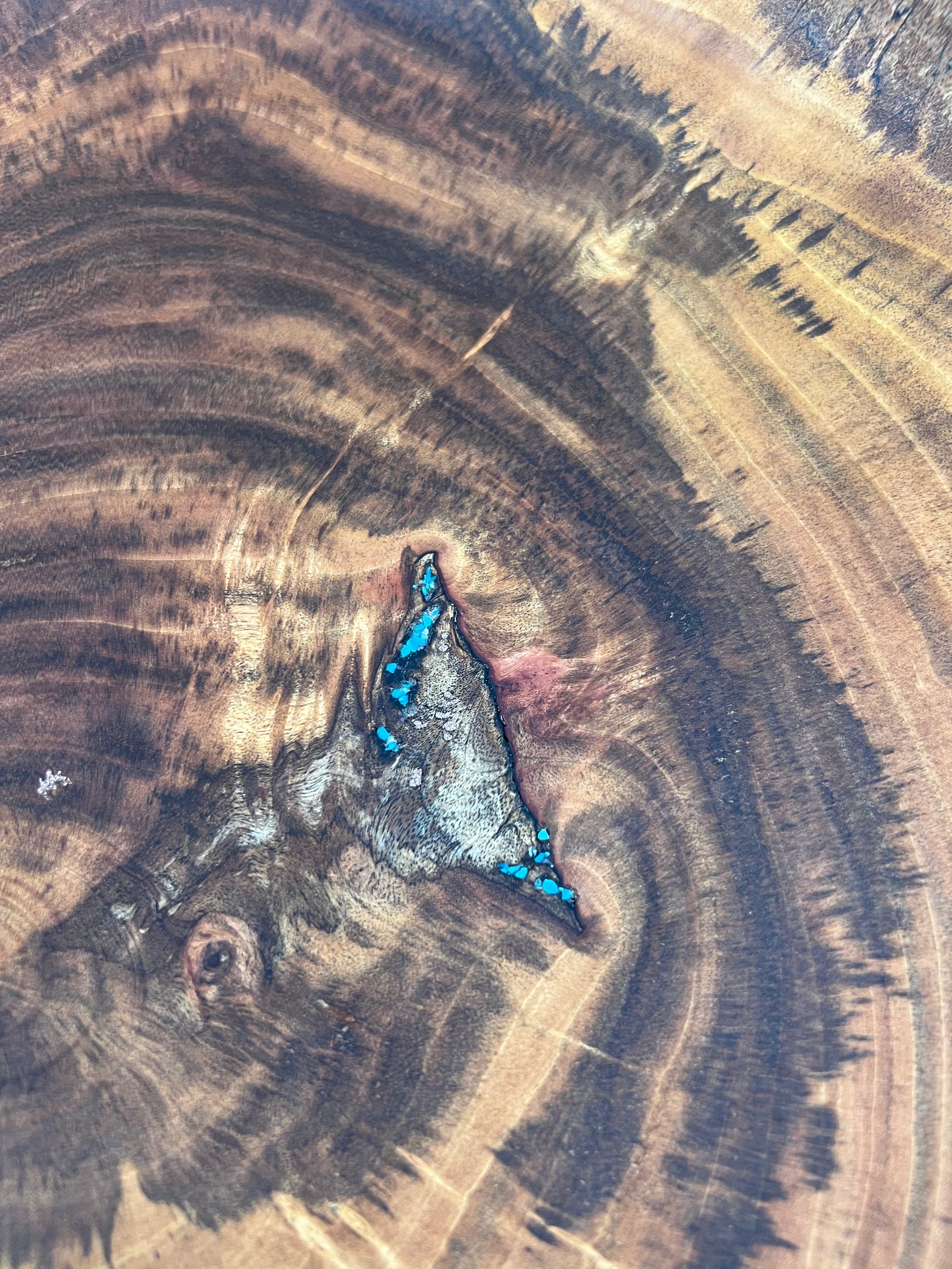 This 17” stunning salad bowl is made from Cuban Mahogany and features gorgeous spalting. I’ve inlayed copper and turquoise into it. It has three carved feet so it will never wobble. It stands 4-4.5” tall and has a food-safe hardwax oil finish. This piece features a live edge, the natural tone of Cuban mahogany and simply amazing grain figure from the spalting.