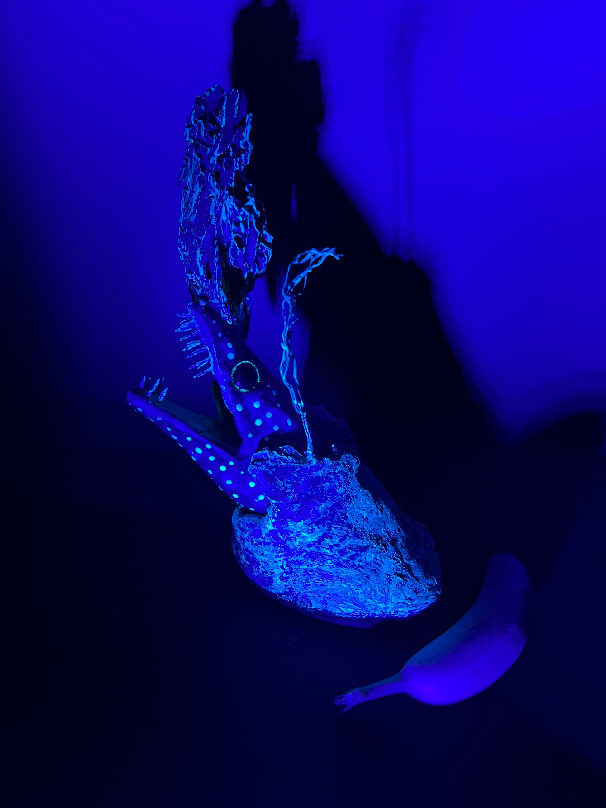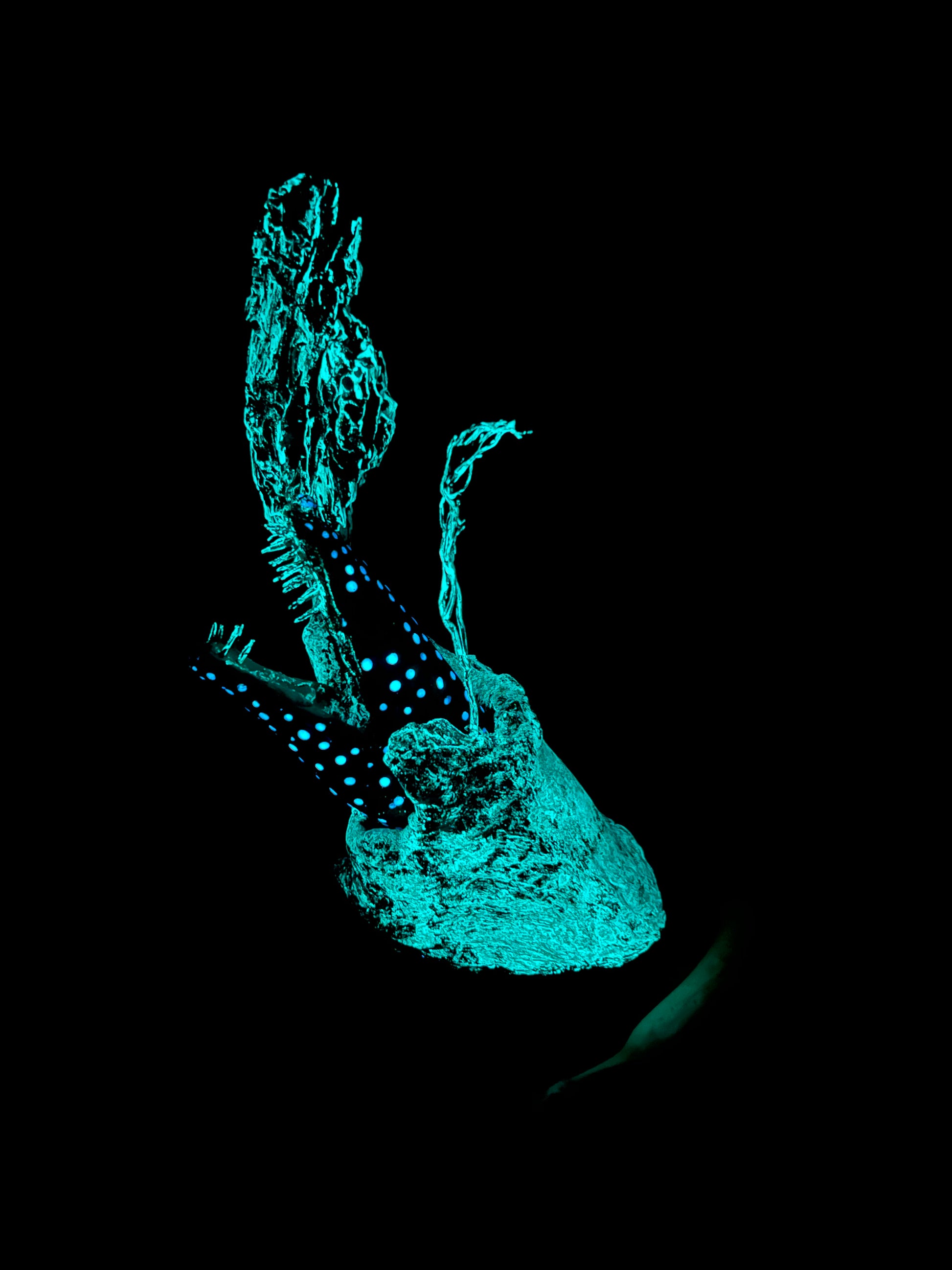This moray features a body made from Cuban mahogany. The eyes are opal chips while the teeth and nostrils are copper cut nails. The moray’s little cave is actually a knothole from a tamarind tree. The “coral” is sea-worm eaten cedar. There’s also a bit of coral that washes up on the beach here in South Florida. The whole piece is highlighted with an ethereal glow that reveals itself in the dark. Sunlight or an ultraviolet flashlight (included) charge up the glow, but ambient light does the trick as well.